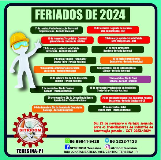 Fique atento, pois 2024 já começou e muitos já se perguntam quanto e quais serão os feriados neste ano. Então teremos 10 feriados nacionais, 03 feriados municipais (para quem mora em Teresina), 01 feriado estadual (PI) e 02 feriados previstos em negociações coletivas de trabalho do sindicato (sendo um deles especifico para os trabalhadores da construção pesada). Como também dias específicos que serem compensados em outros dias.Veja a tabela abaixo: 1º de janeiro: Confraternização Universal (segunda-feira – feriado nacional); 12 de fevereiro: Carnaval (segunda-feira - a ser compensado CCT); 13 de fevereiro: Carnaval (terça-feira - feriado previsto em convenção); 28 de março: Quinta-feira da Paixão (quinta-feira – a ser compensado CCT); 29 de março: Paixão de Cristo (sexta-feira – feriado nacional); 21 de abril: Tiradentes (domingo – feriado nacional); 1º de maio: Dia do Trabalho (quarta-feira – feriado nacional); 30 de maio: Corpus Christi (quinta-feira - feriado municipal); 16 de agosto: Aniversário de Teresina (sexta-feira - feriado municipal); 7 de setembro: Independência do Brasil (sábado – feriado nacional); 12 de outubro: Nossa Senhora Aparecida (sábado – feriado nacional); 19 de outubro: Dia do Piauí (sábado – feriado estadual); 2 de novembro: Finados (sábado – feriado nacional); 15 de novembro: Proclamação da República (sexta-feira – feriado nacional); 20 de novembro: Dia da Consciência Negra (quarta-feira – feriado nacional); 29 de novembro: Dia dos Trabalhadores da Const. Pesada (sexta-feira – feriado para os trabalhadores na indústria da construção pesada – CCT); 08 de dezembro: Dia da Imaculada Conceição (domingo - feriado municipal); 25 de dezembro: Natal (quarta-feira – feriado nacional).